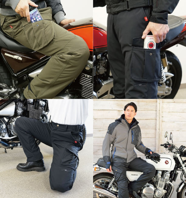 右腿のポケットは、ステップに 足を乗せたまま収納物の出し入れがしやすい角度にオフセットした親切設計。