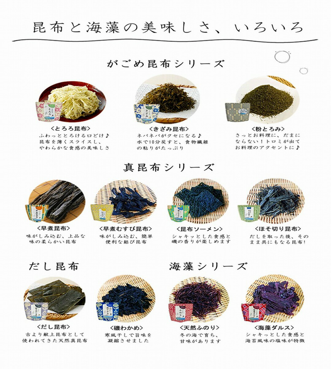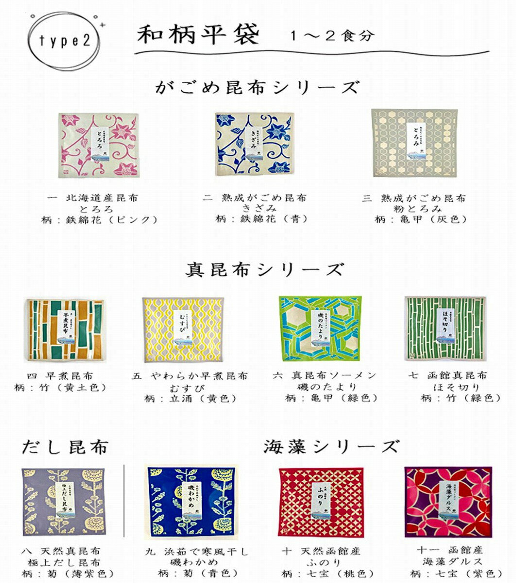 函館で採れるがごめ昆布や真昆布と海藻類を食べやすく小分けにしました。